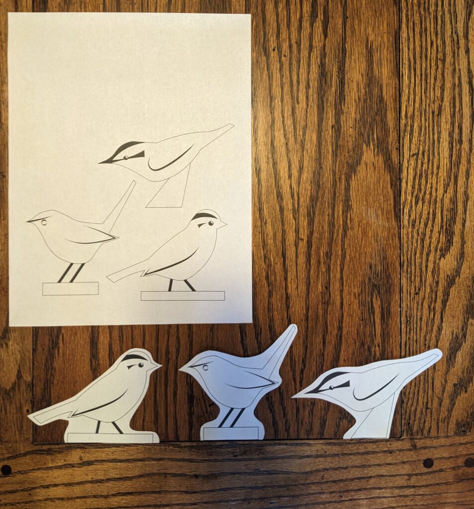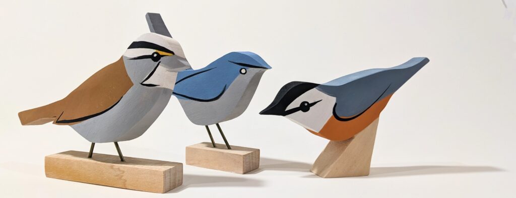 I gave the sparrow and gnatcatcher wire coat-hanger legs and maple bases. The maple was heavy enough compared to the basswood that the birds balanced fine and I didn’t need to add any weight.