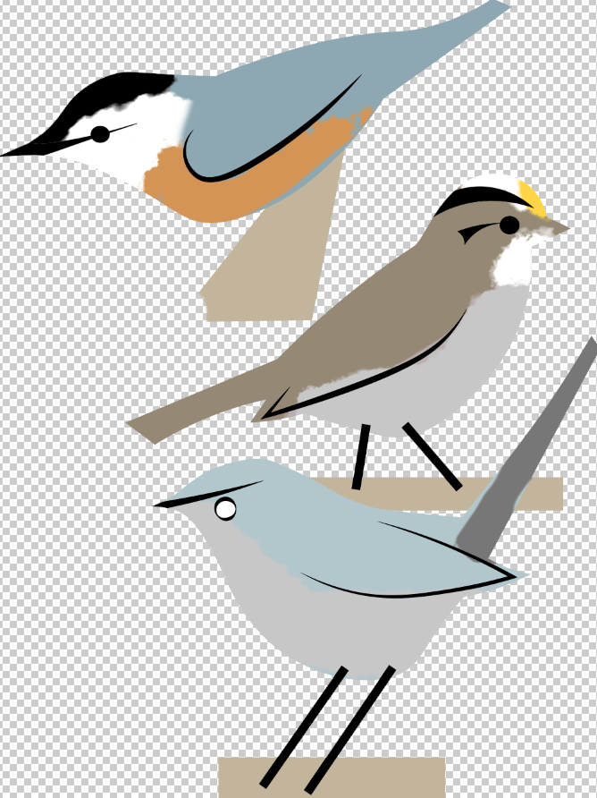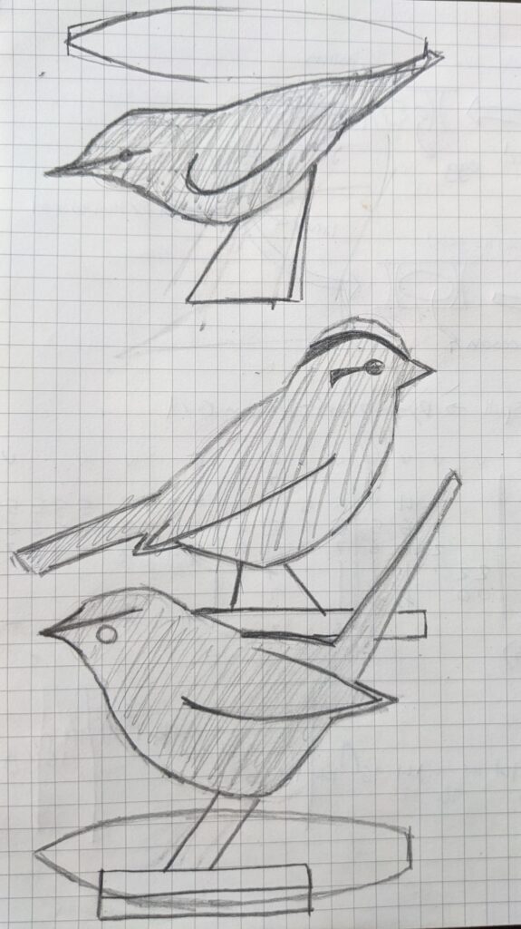 I sketched out simplified shapes of each bird as well as a top profile, then brought them into photoshop to experiment with color placement and make my cutting templates.