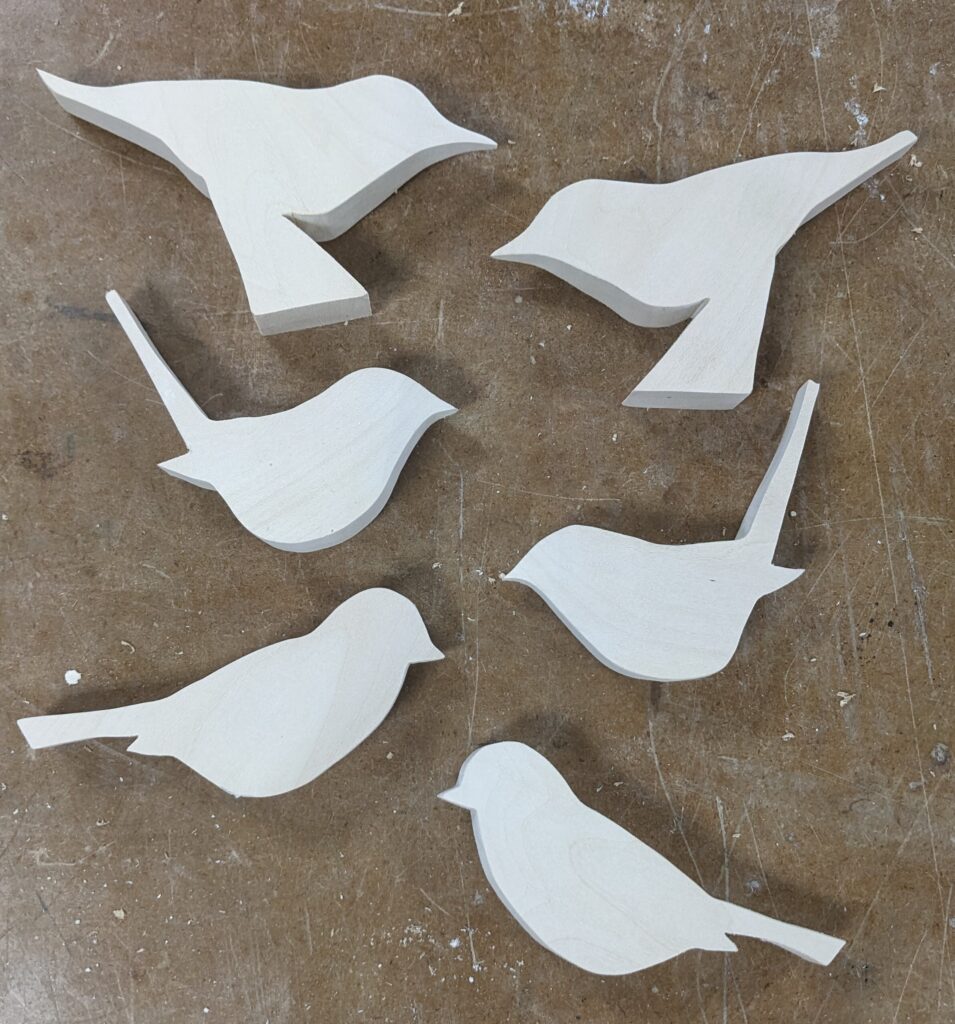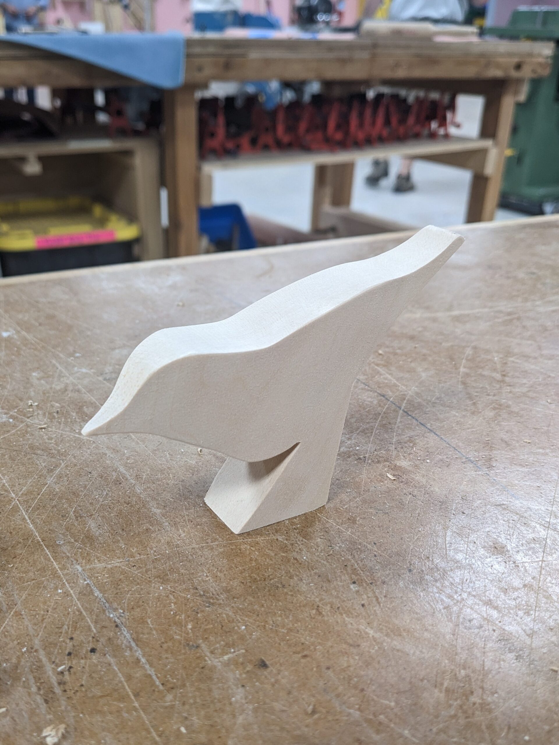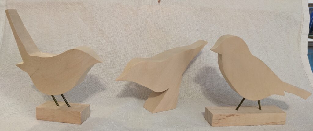 I used a scroll saw to cut the shapes out of a basswood plank planed to a little over an inch. The spindle sander did a good job of smoothing out the edges and taking off any jitters from the scroll saw. I tapered the birds towards the beak to suggest a birdlike shape while still staying abstract and blocky.