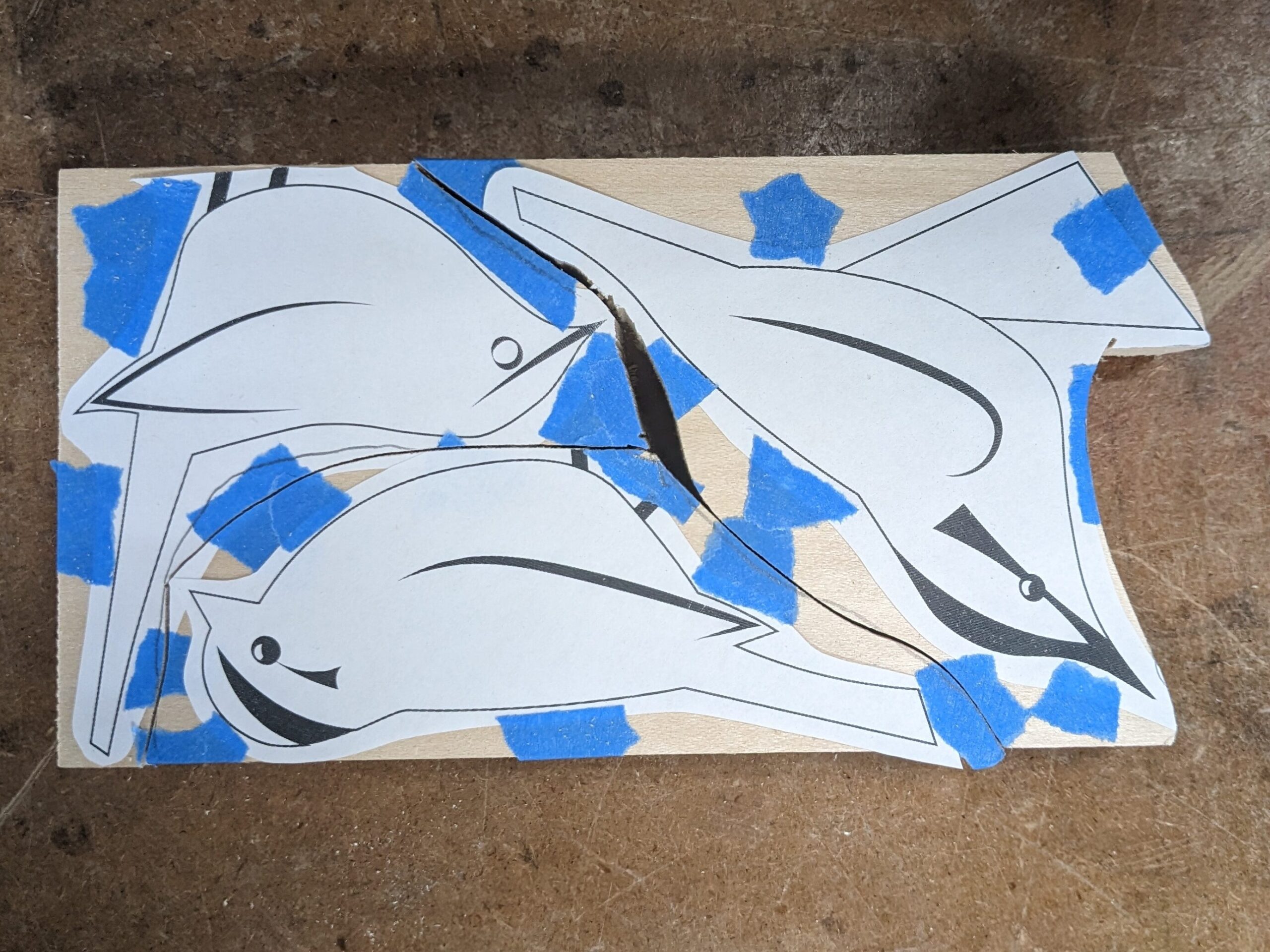 Templates taped to the wood. Double-sided tape makes it easier but I couldn’t find any so I just had to reapply tape every time I cut through it.